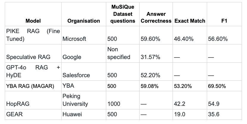 By comparing YBA RAG (MAGAR) with other retrieval-augmented generation systems, we observe that it achieves one of the highest overall performances on the MuSiQue benchmark. With an answer correctness of 59.08%, YBA’s model performs nearly on par with Microsoft’s fine-tuned PIKE RAG (59.60%), while surpassing Salesforce’s GPT-4o RAG + HyDE (52.20%), Google’s Speculative RAG (31.57%), Peking University’s HopRAG (42.2% EM, 54.9 F1), and Huawei’s GEAR (19% EM, 35.6 F1).Notably, YBA MAGAR achieves the best Exact Match (53.2%) and F1 score (69.5%) among all models, demonstrating superior consistency between retrieved context and generated answers. This indicates that MAGAR’s multi-agent retrieval mechanism effectively enhances answer accuracy and contextual alignment.