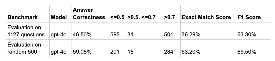 The benchmark results show that our technology achieved an Answer Correctness of 46.50% on the full 1,127-question evaluation, with an Exact Match of 36.29% and an F1 Score of 53.30%. On the random 500-question subset, performance improved to 59.08% Answer Correctness, 53.20% Exact Match, and 69.50% F1 Score, indicating better accuracy and completeness on a smaller evaluation set.