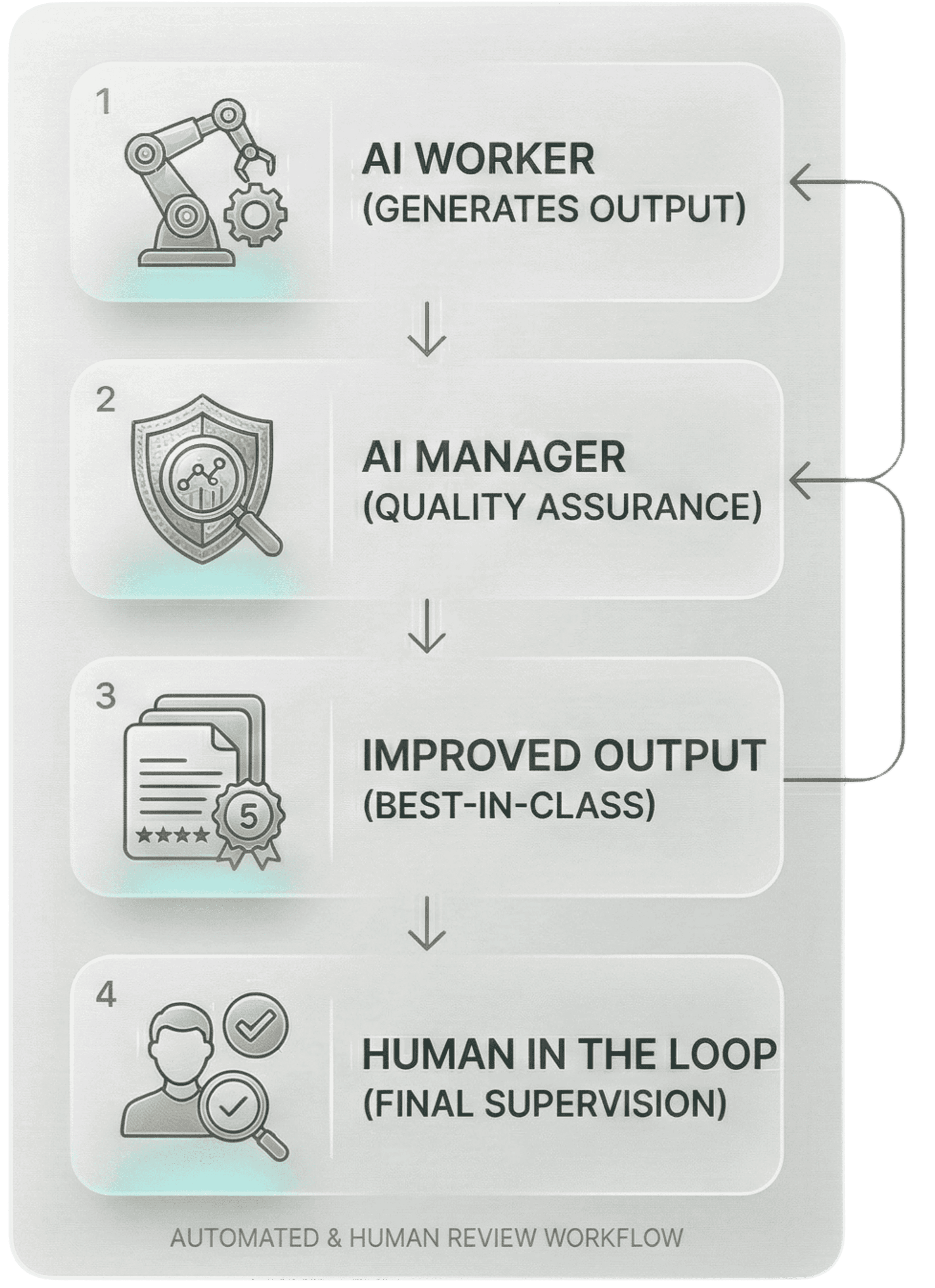 You shouldn't have to micromanage your AI. That is why our processes include an autonomous Manager AI. It strictly reviews the outputs of your AI Workers against your standards, catching errors and forcing revisions behind the scenes. Your human team only receives best-in-class results